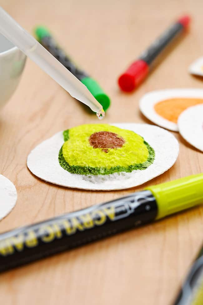 Adding water to an avocado drawing to make 3D art on compressed sponge paper