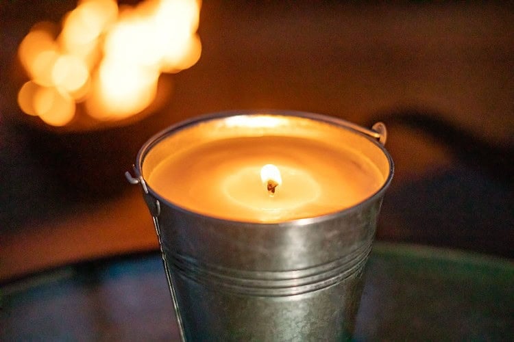 We used small metal buckets to make our citronella candles, which adds a rustic, outdoorsy vibe to the candle. Be careful with the buckets you choose – galvanized steel may not be watertight, meaning the wax can leak out.