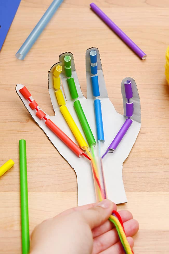 The yarn in this craft acts like tendons — the parts in our body that help pull our fingers when we move them. When you pull on the strings, the fingers bend because the straw pieces work like joints, just like our knuckles. It’s not exactly like a real hand (the thumb doesn’t move in the same way), but it’s a fun way to learn the basics of how hands work!
