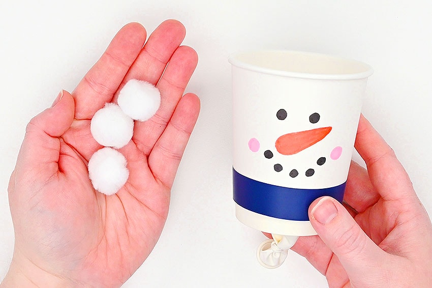 Add the pom poms into the cup and pull down on the balloon. Let it go to see the pom poms fly into the air.